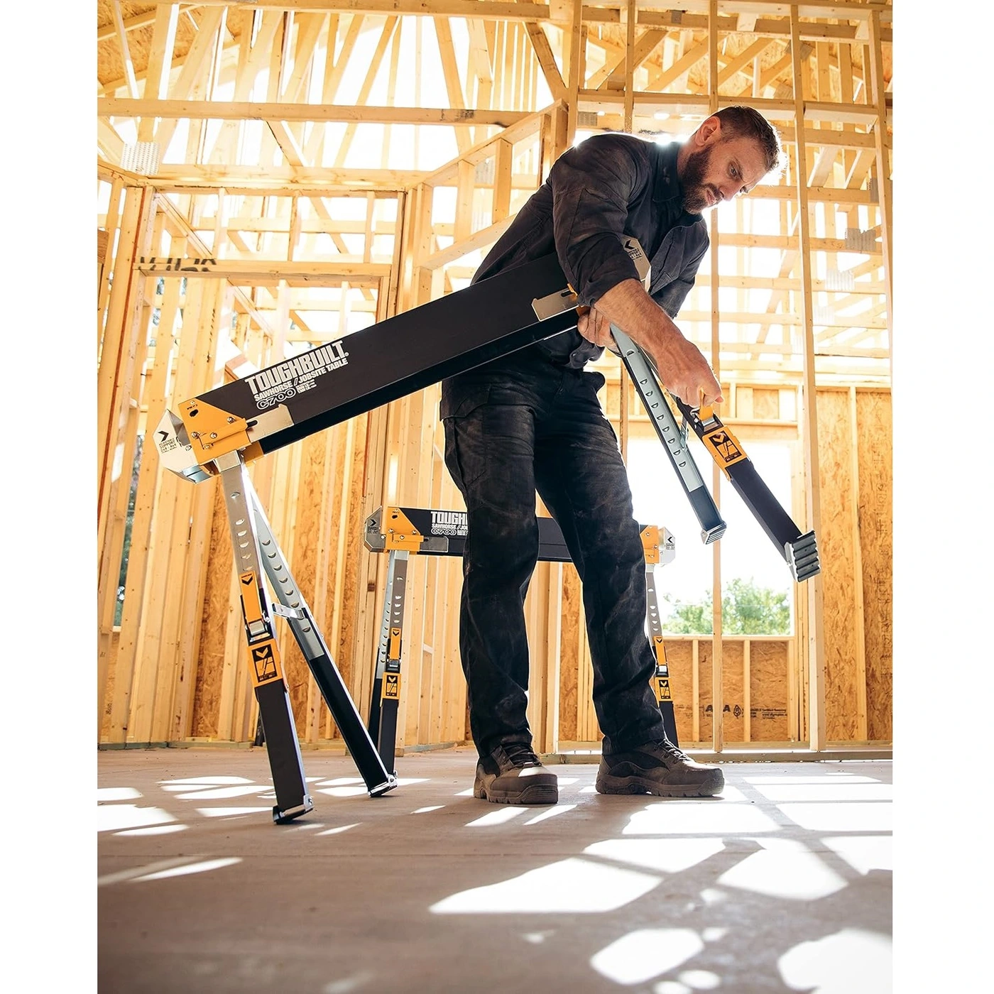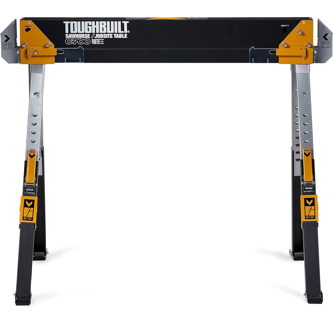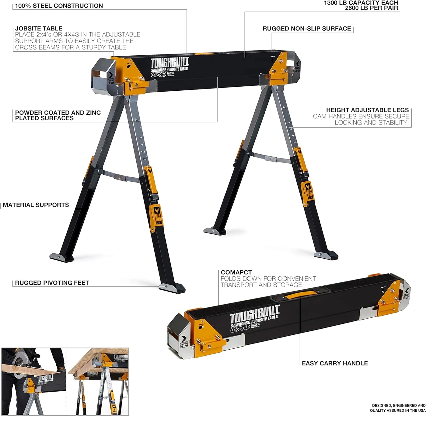 O ToughBuilt® C700 Sawhorse and Jobsite Table é durável, robusto e oferece valor inigualável. Construído em aço 100% de alta qualidade, este sawhorse tem uma capacidade notável de 1300 lb. sozinho, e 2600 lb. por par.