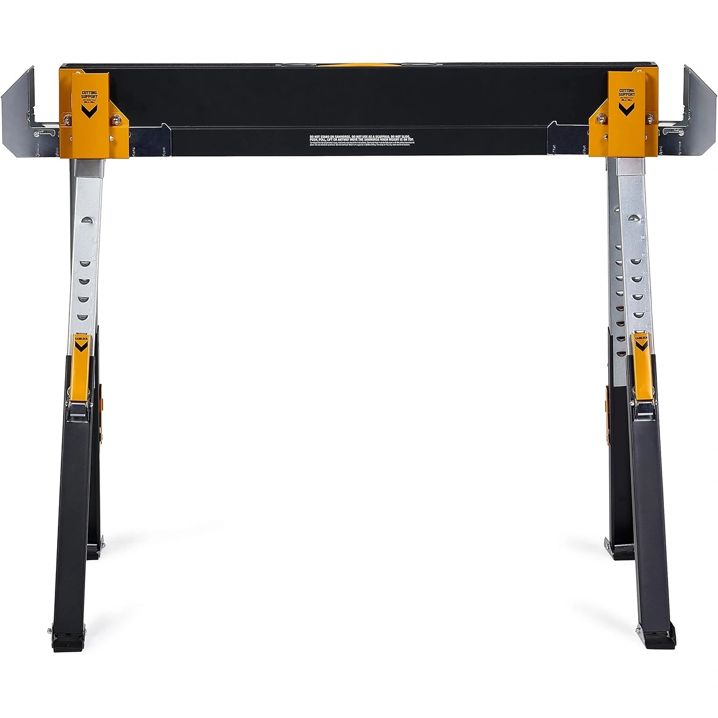 Transforme 2 cavaletes em uma mesa de trabalho sólida: possui braços de suporte que se ajustam para encaixar 2x4s ou 4x4s. Suas pernas telescópicas permitem que o cavalete trabalhe em qualquer terreno. Também inclui pinos inovadores de corte e suporte de material que permitem o corte seguro e fácil de materiais. Ele também tem pés firmes e fáceis de dobrar para uso em todas as superfícies. Com um mecanismo de abertura rápida, a configuração é direta e simples. O aço revestido a pó e zincado previne a corrosão e resiste a ambientes rigorosos. Este cavalete dobrável inclui uma alça de transporte fácil para transporte sem esforço e bordas enroladas para segurança e conforto.
