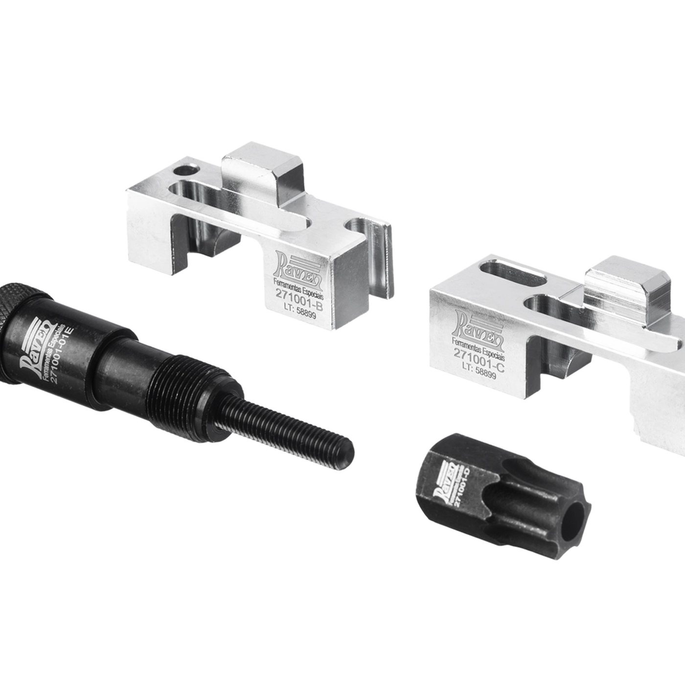 2 ferramentas para posicionar as árvores de comando (chave hexalobular T100 com guia para parafuso das engrenagens das árvores de comando e ferramenta para tensionar a corrente durante o aperto do parafuso das engrenagens das árvores de comando)