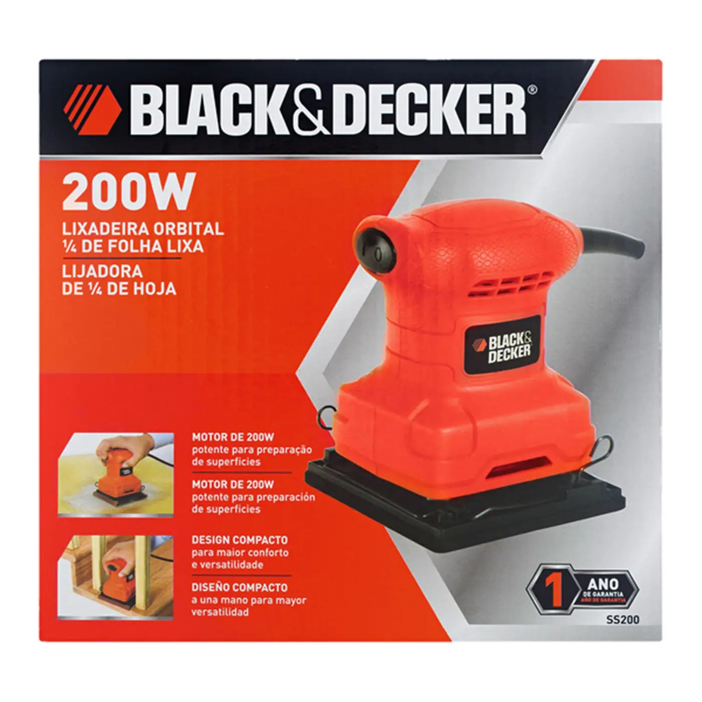 Lixadeira Orbital Profissional 1/4 de Lixa 200W BlackDecker SS200 com design ergonômico e de fácil utilização. Ideal para madeiras, paredes, materiais sintéticos entre outros. Ótima para lugares de difícil acesso.