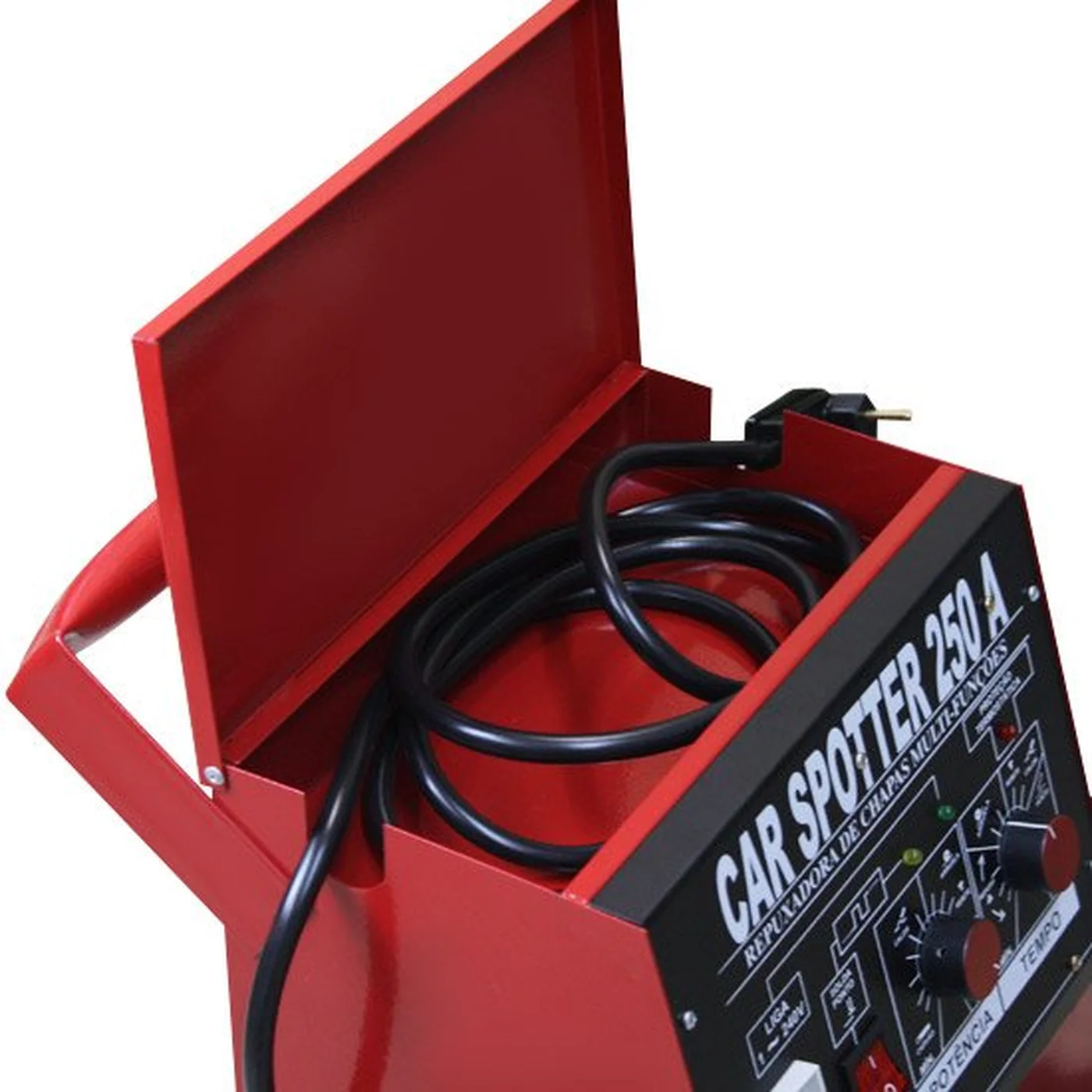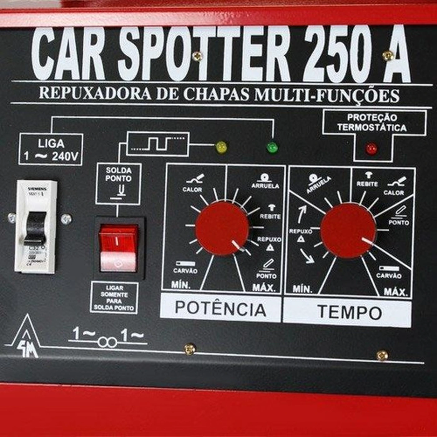 -Equipamento tipo Spotter Multifunções Analógica 250 A, projetado para recuperação automotiva, executando serviços de repuxamento de chapa, contração, aquecimento (calor) e ponto de solda provisória.