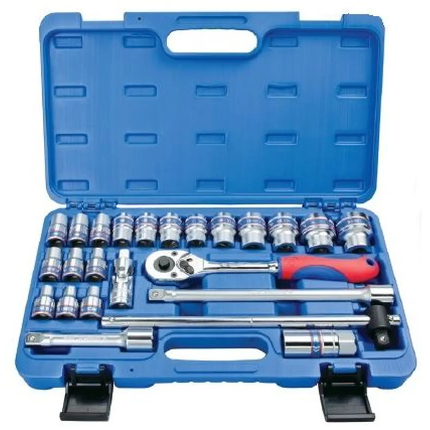 - 1 Catraca reversível 10”: 18 Soquetes estriados: 8, 9, 10, 11, 12, 13, 14, 15, 16, 17, 18, 19, 21, 22, 24, 27, 30, 32mm;
