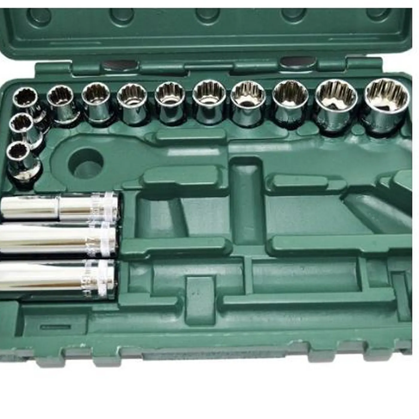 - 12 soquetes estriados: 24, 22, 19, 18, 17, 16, 15, 14, 13, 12, 11 e10mm