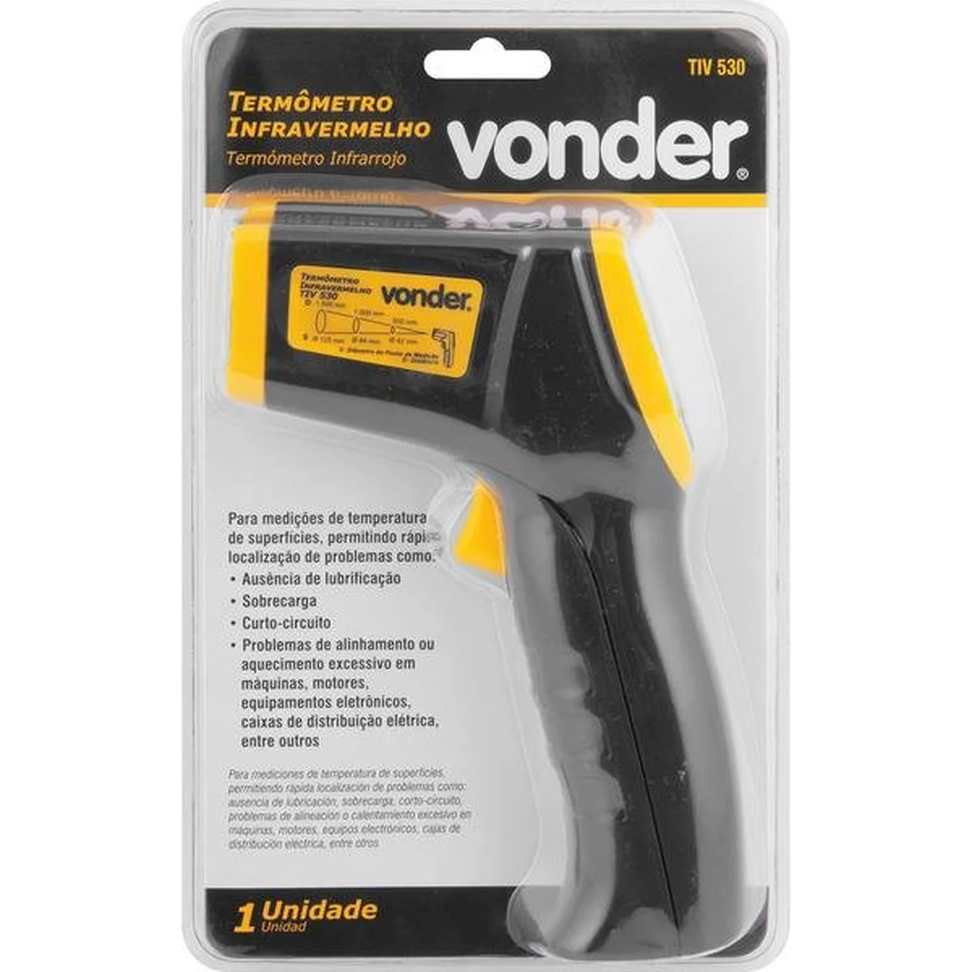 Termômetro infravermelho, acompanha: 1 bateria DE 9V. Ultilizado para medições de temperaturas de superfícies, permitindo localização rápida de problemas (ausência de lubrificação, sobrecarga, curto-circuito, equipamentos com problemas de alinhamento ou aquecimento excessivo em máquinas, motores, equipamentos eletrônicos, caixas de distribuição elétrica, entre outros) reduzindo o tempo de diagnóstico e trabalho. Quanto maior a distância do objeto em relação ao termômetro, maior será o diâmetro de abertura do termômetro infravermelho. O medidor possui uma resolução óptica (razão entre a distância e o diâmetro) de 12:1, ou seja, para 500 mm de distância o diâmetro de medição é de 42 mm. Para um resultado satisfatório, o objeto a ser medido deve ser pelo menos de 1,5 a 2 vezes maior que a amplitude do campo de medição. Não indicado para medição de temperatura corporal.Possui visor de cristal líquido com ou sem opção de iluminação, desligamento automático após 8 segundos sem uso, indicador de bateria fraca e funções temperatura máxima/temperatura mínima. Conta também com ponto laser, que auxilia o trabalho deixando a medição mais precisa. Possui ajuste de emissividade, que permite melhor precisão na medição conforme o tipo de material, e 32 posições de memória, que registra as últimas medições realizadas.