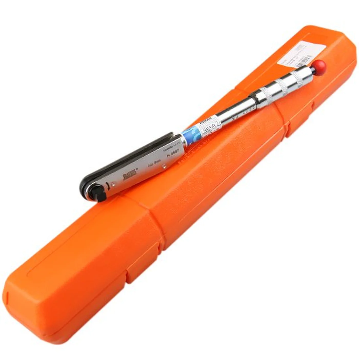 Nome: Torquímetro de estalo de 0,5 a 3,4 kgf.m com encaixe de 3/8". Produto fornecido em um estojo plástico especial.