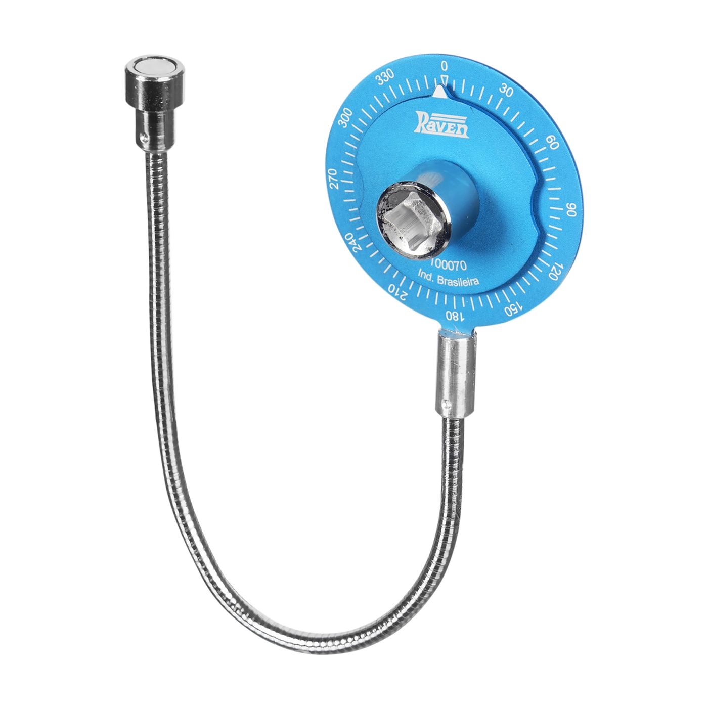Nome: Transferidor com 360° e encaixes quadrados de 1/2Chr(34) para aplicação de torques angulares. Possui braço metálico flexível com ponta imantada e escala com divisão de 5 em 5 graus. Torque máximo suportado: 500 Nm. Discos com acabamento anodizado na cor azul nas unidades fabricadas a partir do lote 52068/17, de abril de 2017.